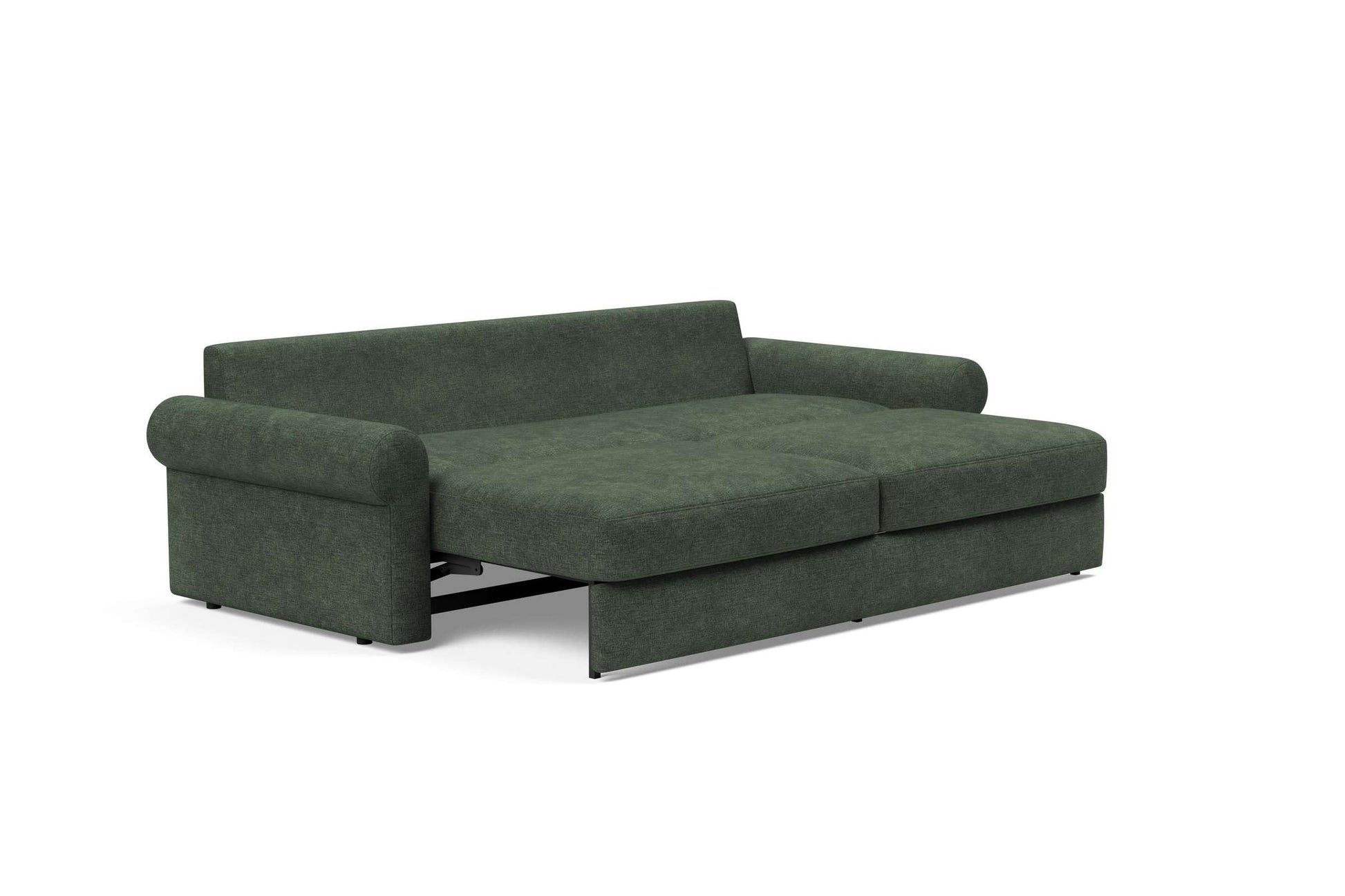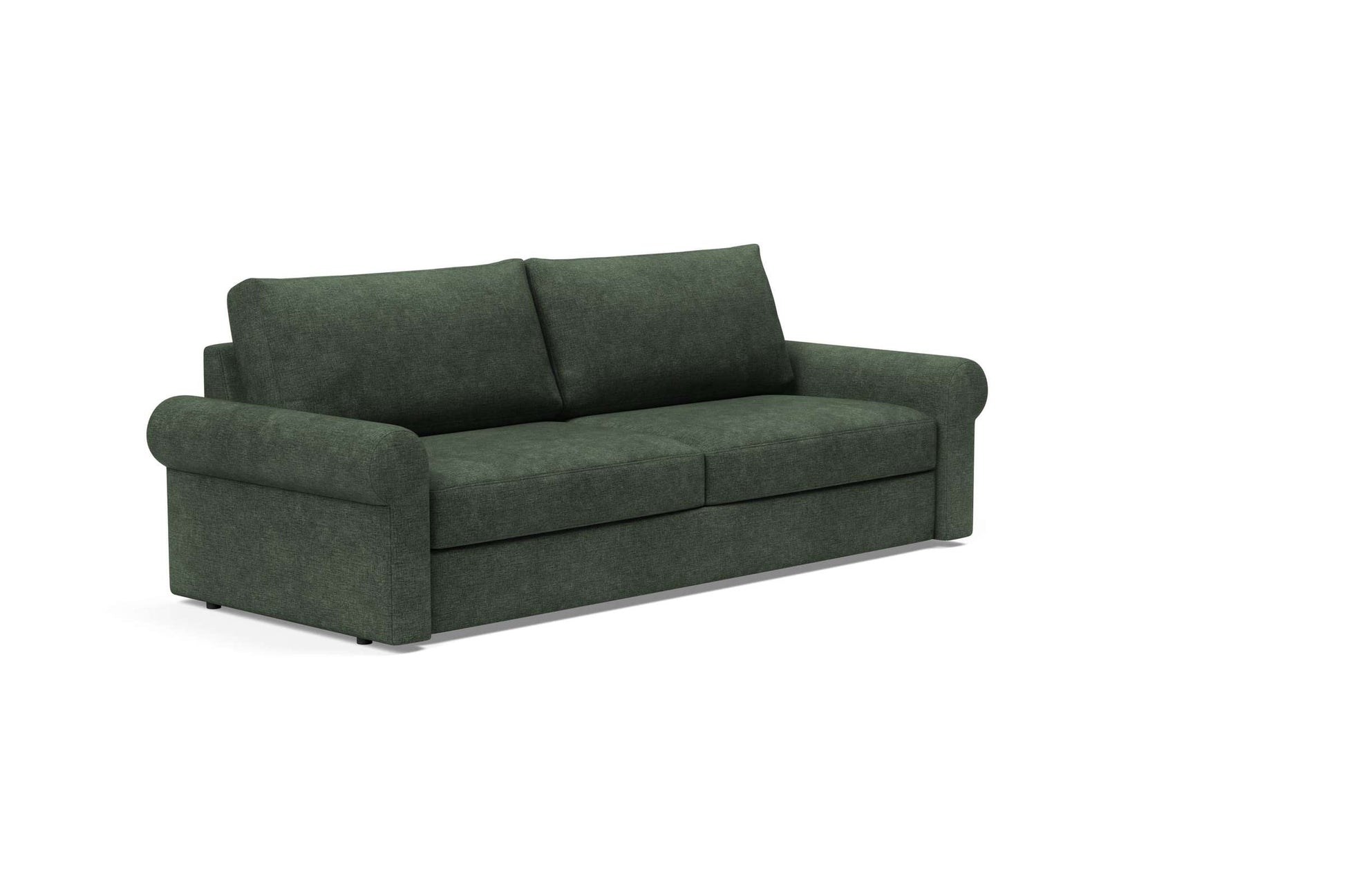 The Vilander Sofa Bed w/Roll Arms in Avella Pine Green by Innovation Living is a beautifully designed piece that combines comfort and versatility. Ideal for both small and large spaces, this sofa bed offers a stylish solution for accommodating guests without compromising on aesthetics. Its unique design features automatically foldable legs, allowing you to switch from a comfortable sofa to a spacious full-size bed in seconds.